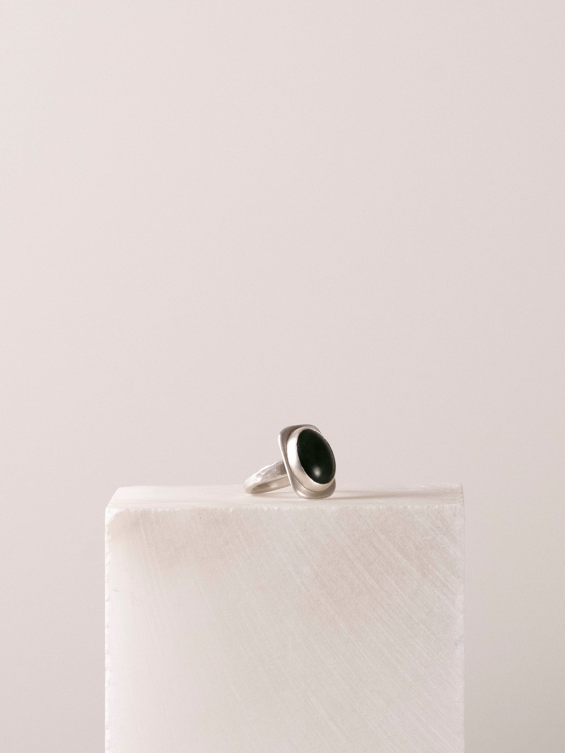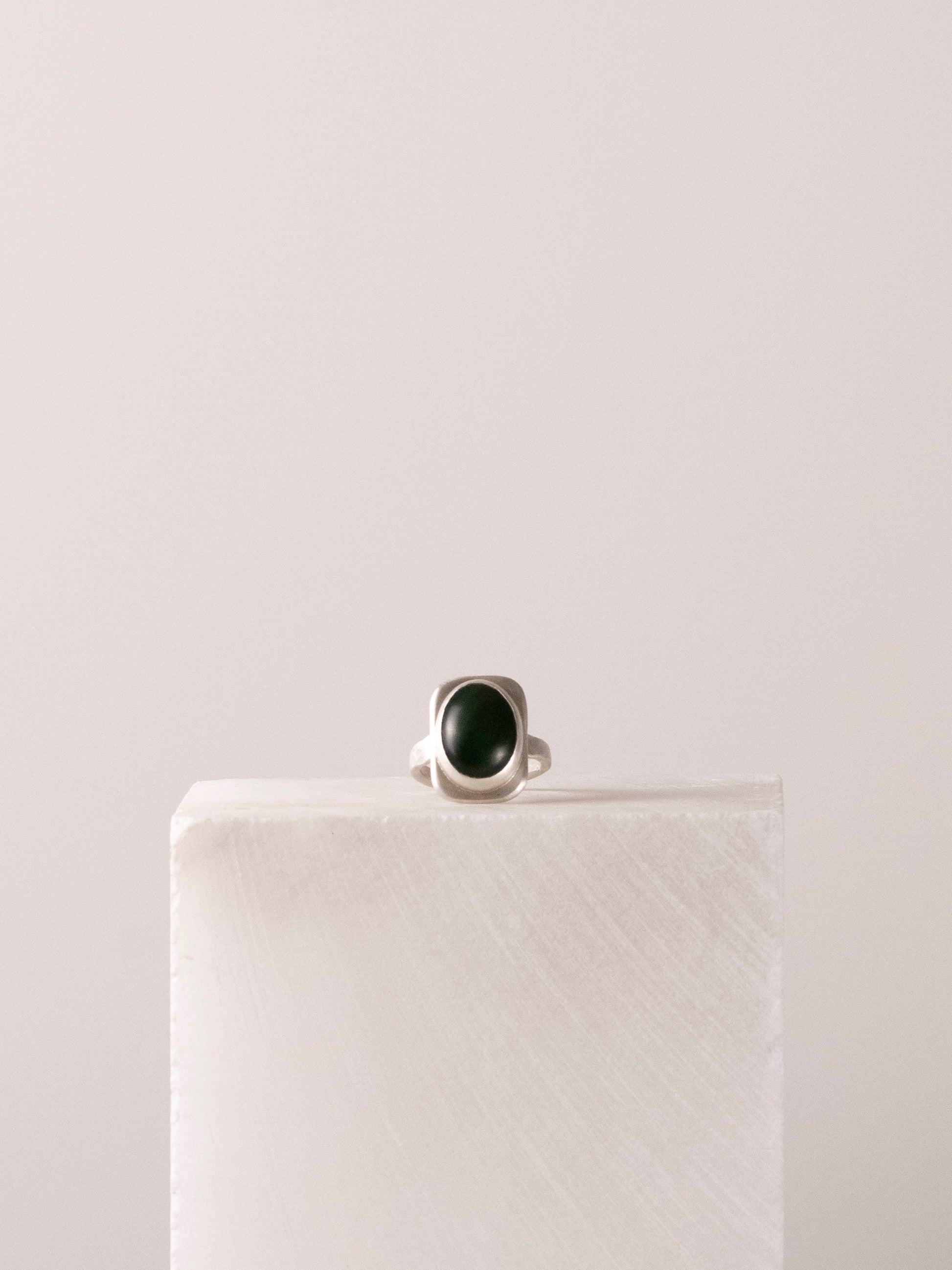 Rectangular sterling silver ring with satin dark green jade cabochon.